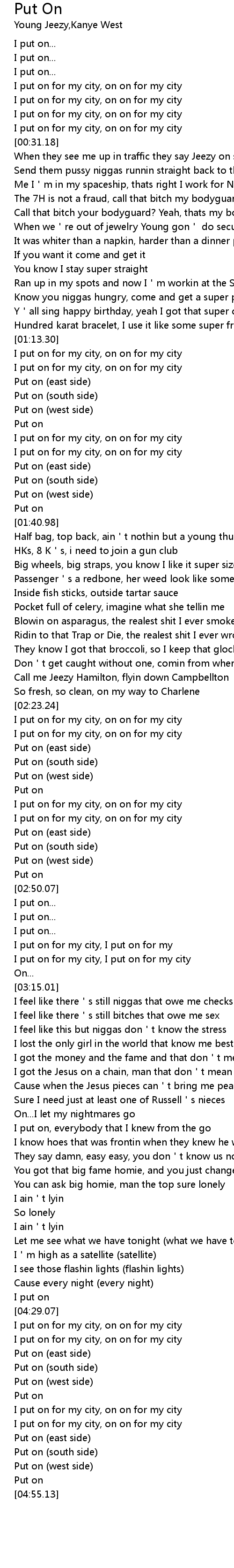 | [01:30.25] | I put on for my city, on on for my city |