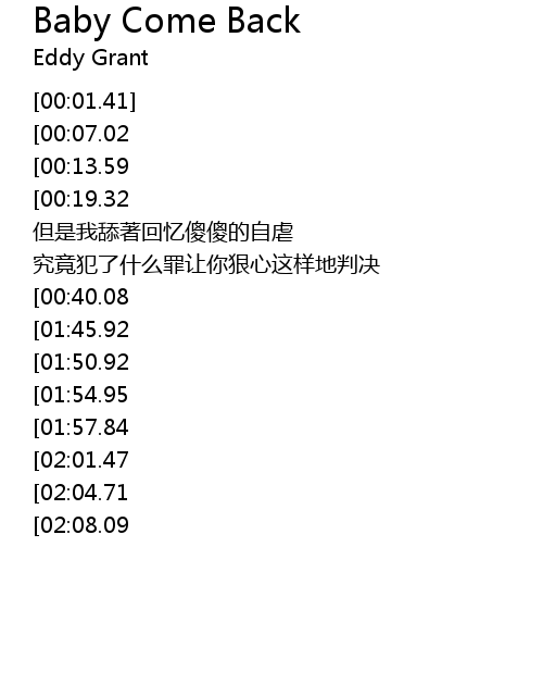 | [02:31.18][02:08.09][01:05.19] | tīng wǒ shuō yī wàn biàn BABY COME BACK |