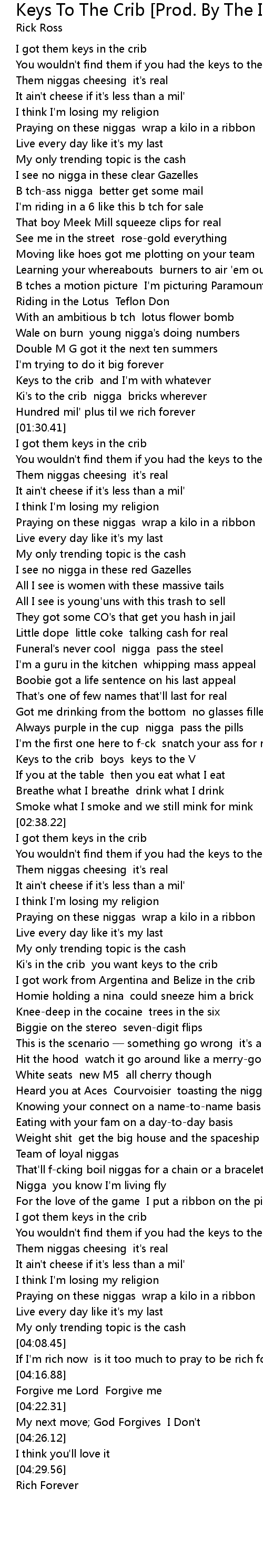 | [03:01.02] | Ki' s in the crib you want keys to the crib |
