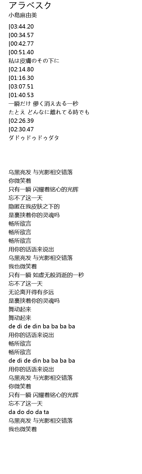 | [00:26.39][03:44.20][03:10.97][01:32.38] | 黒い髪 光と絡まりあって |