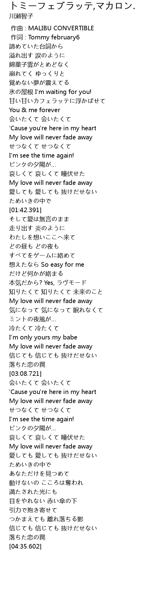 | [00:57.299] | 甘い甘いカフェラッテに浮かばせて |