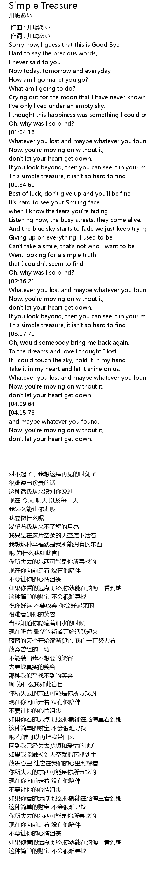 | [04:42.11][04:15.78] | This simple treasure, it isn't so hard to find. |