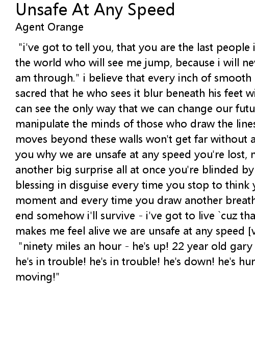 [voice of evel knievel:] "i've got to tell you, that you are the last people in the world who will see me jump, because i will never, ever, ever jump again. i am through." i believe that every inch of smooth cement upon this earth is sacred that he who sees it blur beneath his feet will always be one step ahead i can see the only way that we can change our future is to brainwash and manipulate the minds of those who draw the lines that form the city scapes what moves beyond these walls won't get far without abusing all the laws i'll tell you why we are unsafe at any speed you're lost, now shut your eyes get ready for another big surprise all at once you're blinded by the flashing lights a blessing in disguise every time you stop to think you waste another precious moment and every time you draw another breath you're one breath closer to the end somehow i'll survive - i've got to live `cuz that's the only thing that makes me feel alive we are unsafe at any speed [voice of announcer at gary wells jump:] "ninety miles an hour - he's up! 22 year old gary wells. he's missed it! he's in trouble! he's in trouble! he's down! he's hurt! my god - he's not even moving!" |