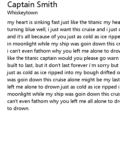 my heart is sinking fast just like the titanic my heart is pumping blood that's turning blue well, i just want this cruise and i just can't imagine i'm drowning and it's all because of you just as cold as ice ripped into my bough drifted off in moonlight while my ship was goin down this cruise alone might be my last and i can't even fathom why you left me alone to drown my heart is sinking fast just like the titanic captain would you please go warn the crew well, everything is built to last, but it don't last forever i'm sorry but the end is coming soon just as cold as ice ripped into my bough drifted off in moonlight while my ship was goin down this cruise alone might be my last and i can't even fathom why you left me alone to drown just as cold as ice ripped into my bough drifted off in moonlight while my ship was goin down this cruise alone might be my last and i can't even fathom why you left me all alone to drown why you left me all alone to drown. |