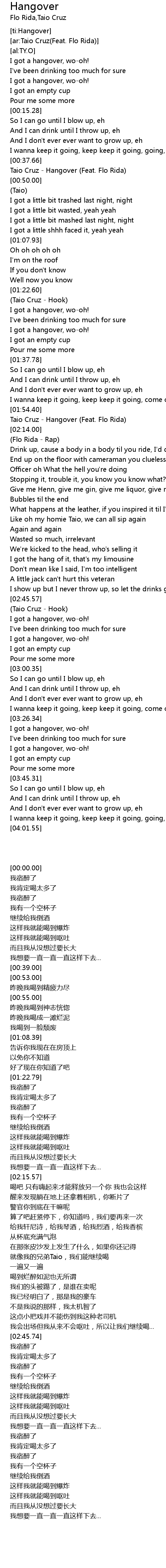 | [00:39.00] | Taio Cruz - Hangover (Feat. Flo Rida) |