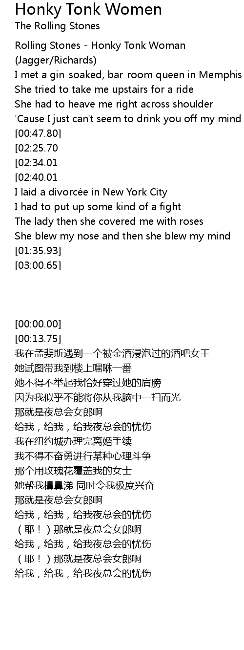 | [02:41.37][02:25.70][01:38.66][00:50.51] | It' s the Honky Tonk Women |