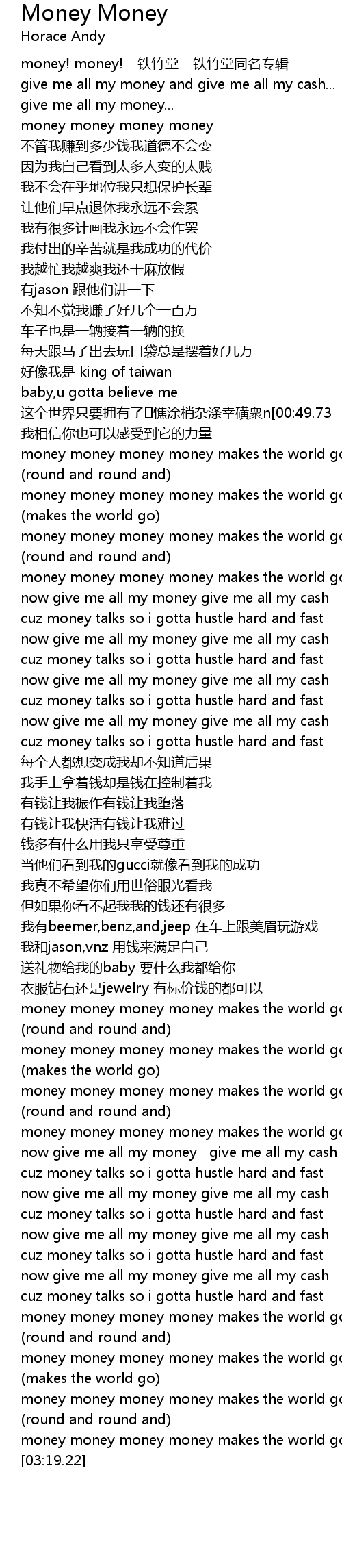 | [01:15.18] | now give me all my money give me all my cash |