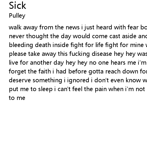 | walk away from the news i just heard with fear born sweat running down my face i never thought the day would come cast aside another sick son what do i do bleeding death inside fight for life fight for mine why is this happening to me please take away this fucking disease hey hey wash away the pain i don't want to live for another day hey hey no one hears me i'm all alone inside this agony forget the faith i had before gotta reach down for some thing more something i deserve something i ignored i don't even know what i'm fighting for lay me down put me to sleep i can't feel the pain when i'm not awake why is this happening to me |