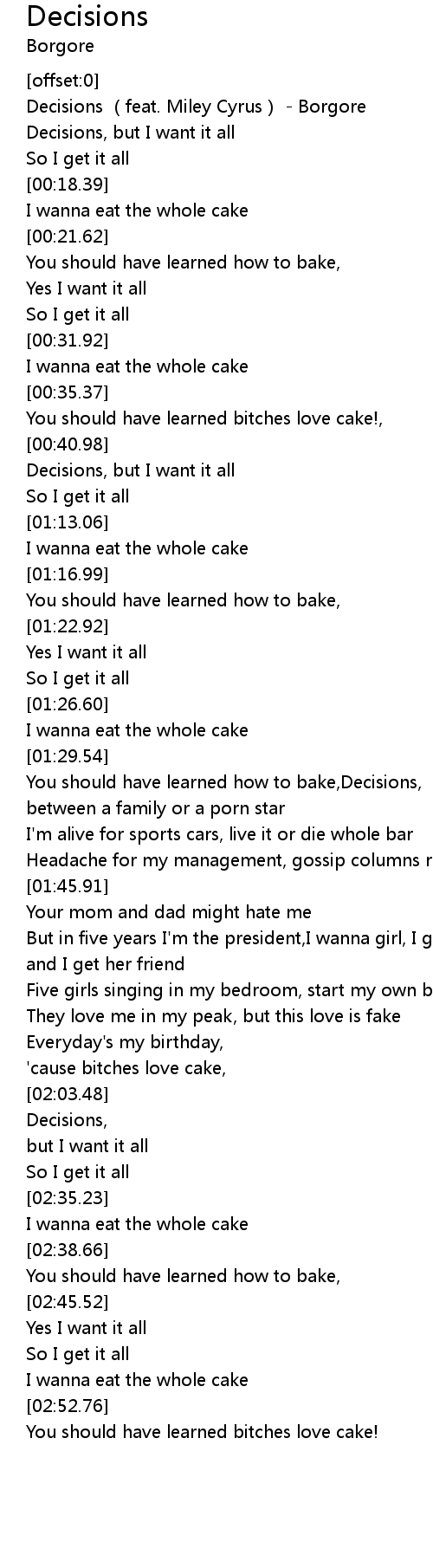 | [00:00.99] | Decisions feat. Miley Cyrus Borgore |