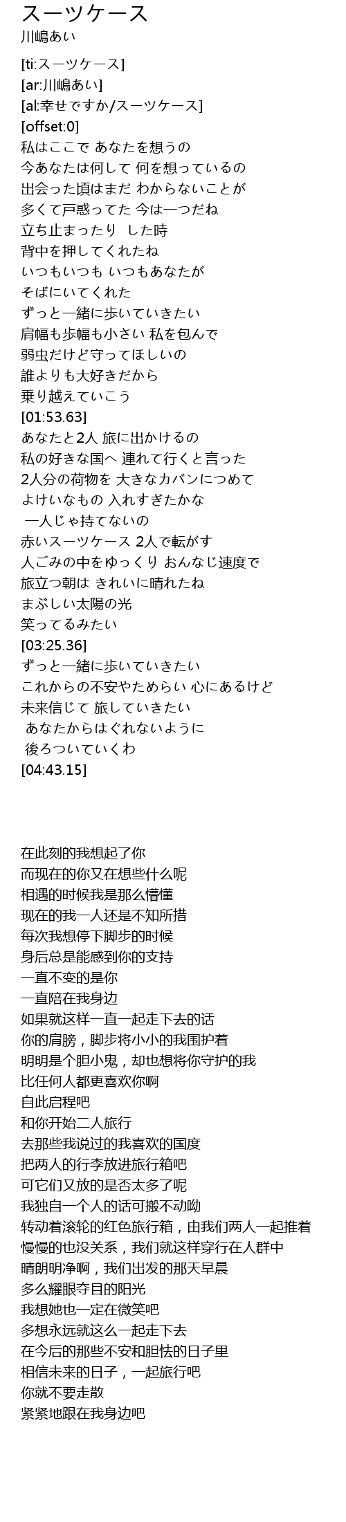 | [02:42.03] | 赤いスーツケース 2人で転がす |