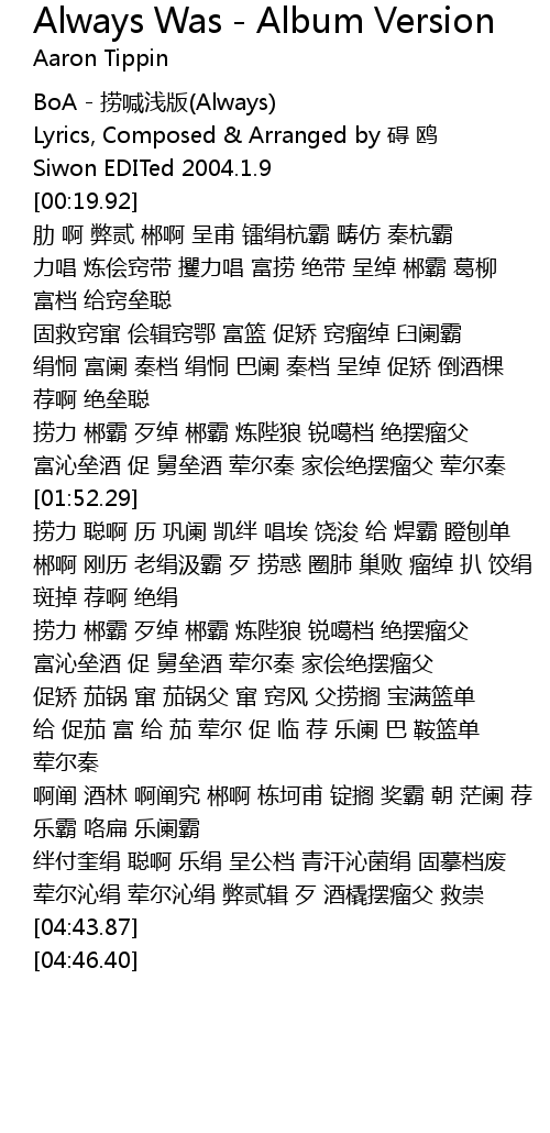 | [00:00.88] | BoA - 捞喊浅版(Always) |