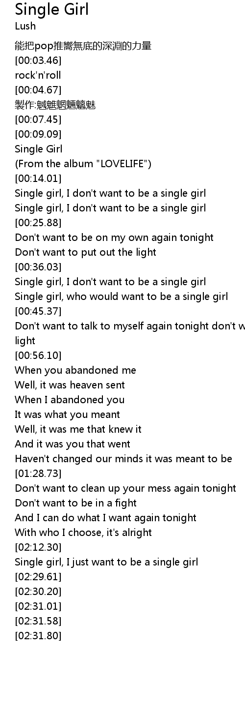 | [02:20.60] | Single girl, I just want to be a single girl |