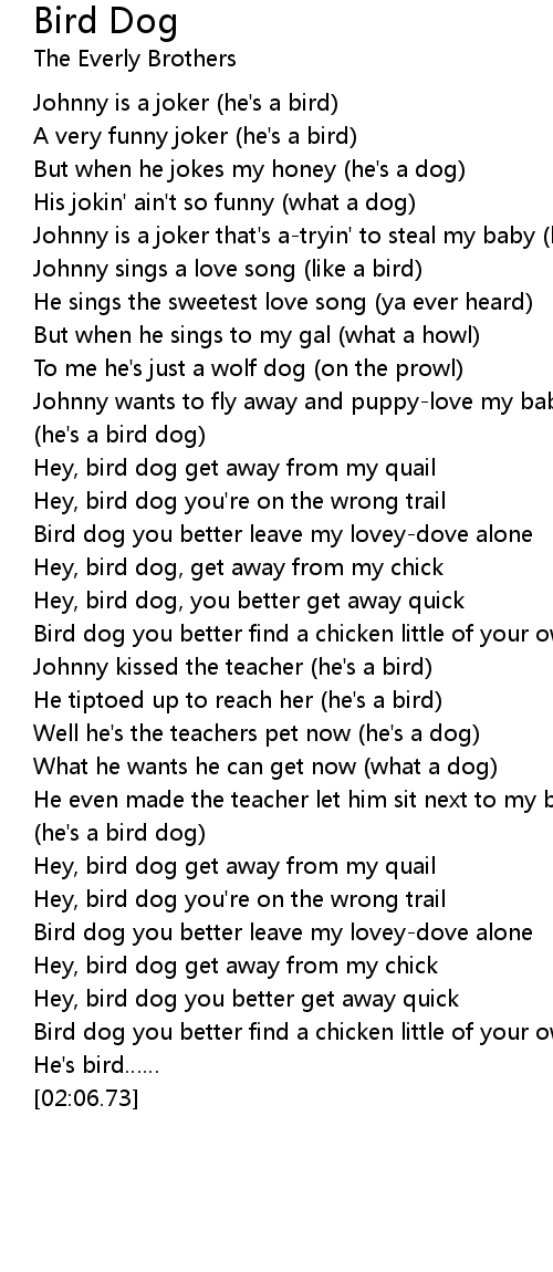 | [00:19.69] | Johnny is a joker that' s atryin' to steal my baby he' s a bird dog |
