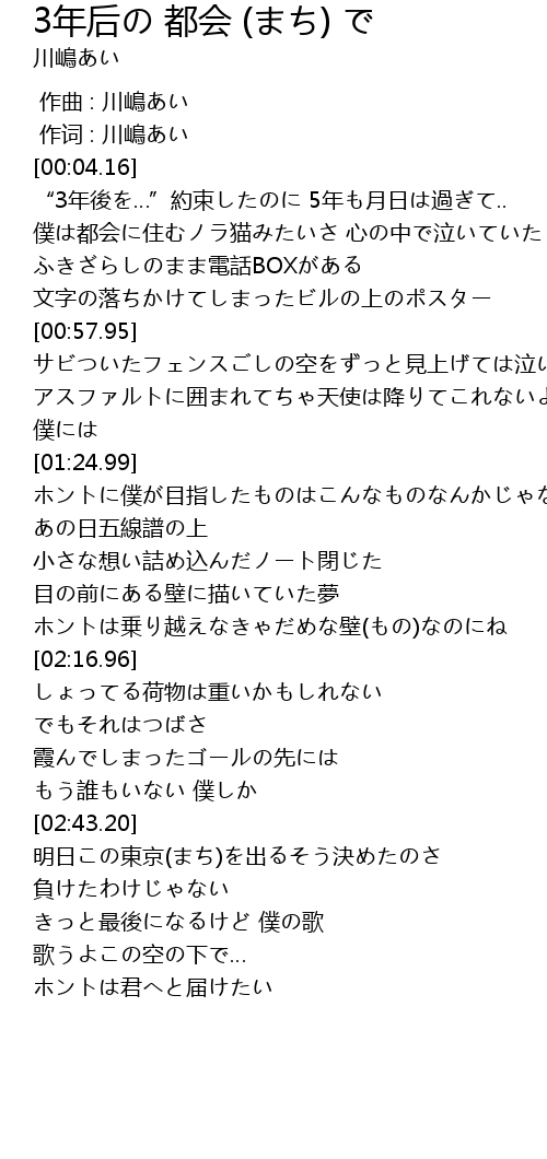 | [03:02.18] | 明日この東京(まち)を出るそう決めたのさ 負けたわけじゃない |