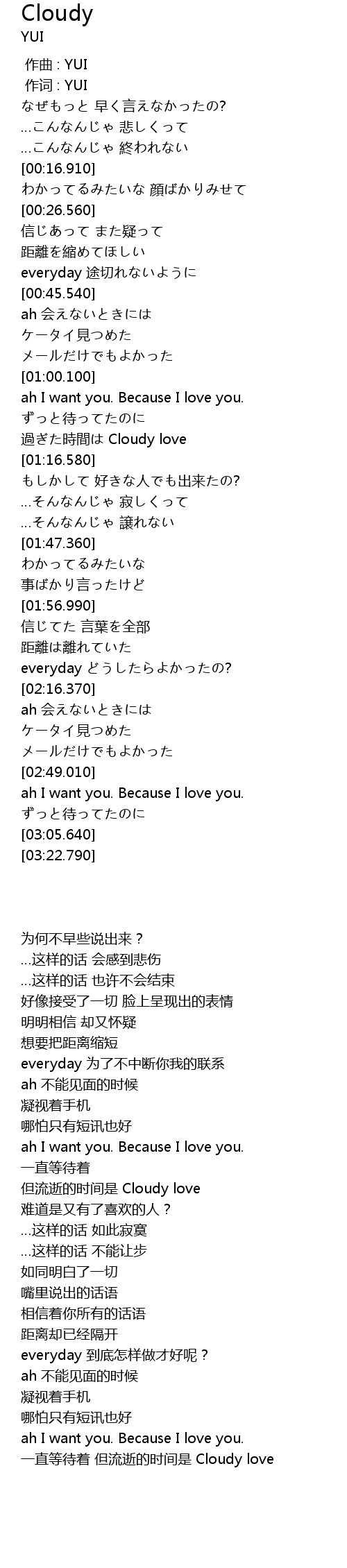 | [01:12.130] | 過ぎた時間は Cloudy love |