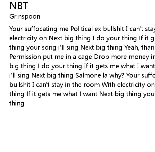 Your suffocating me Political ex bullshit I can't stay in the room With electricity on Next big thing I do your thing If it gets me what I want Next big thing your song i'll sing Next big thing Yeah, thank god for sanctuary Permission put me in a cage Drop more money in I'm dancing like a puppet Next big thing I do your thing If it gets me what I want Next big thing your song i'll sing Next big thing Salmonella why? Your suffocating me Political ex bullshit I can't stay in the room With electricity on Next big thing I do your thing If it gets me what I want Next big thing your song i'll sing Next big thing