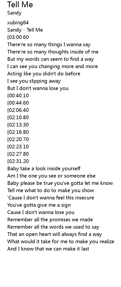 | [03:22.30][02:20.70][01:02.30] | Tell me that we' ll be together |