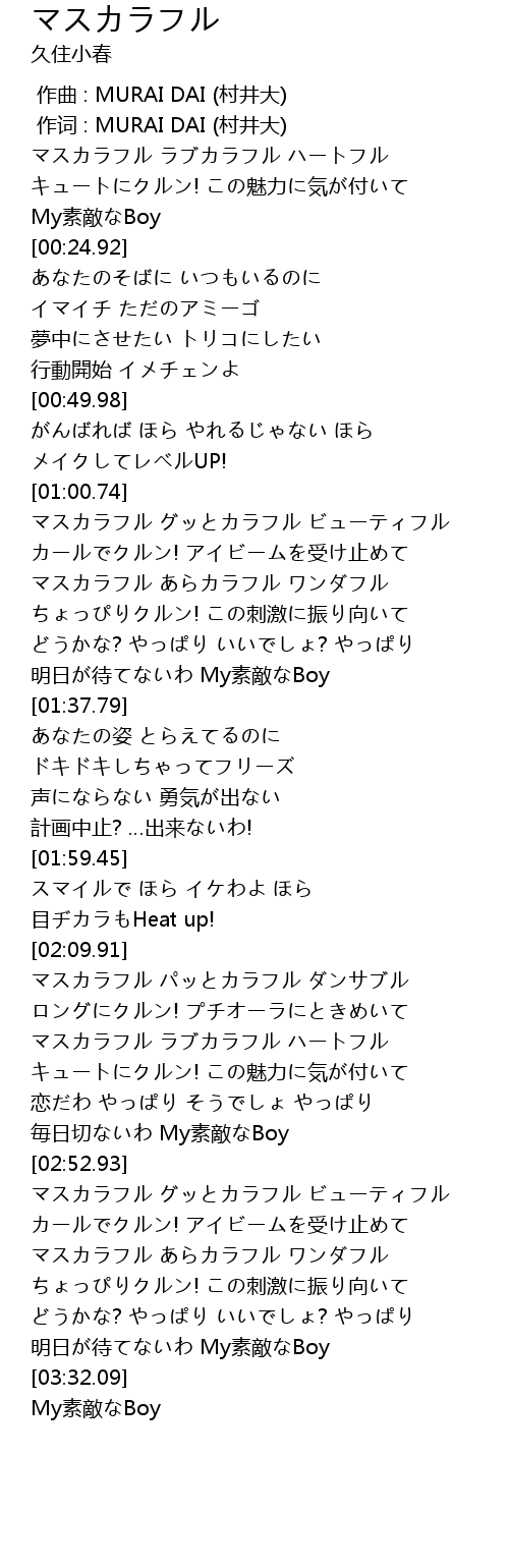 | [00:10.12] | マスカラフル ラブカラフル ハートフル |