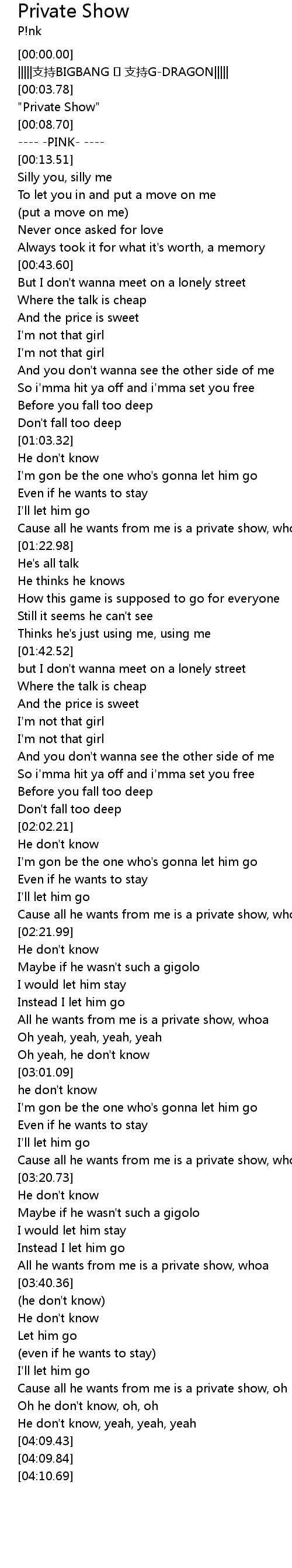| [02:34.40] | All he wants from me is a private show, whoa |
