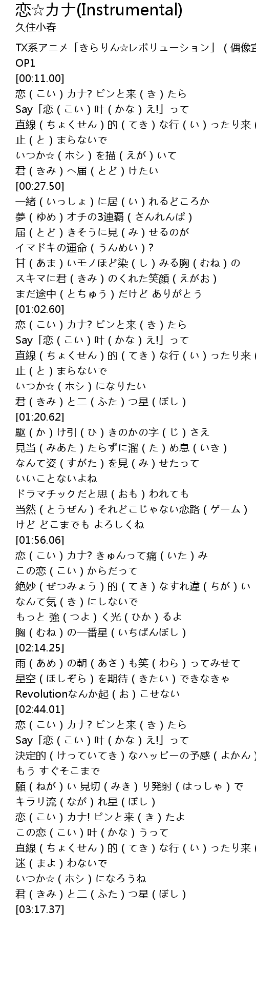 | [03:02.02] | 恋(こい)カナ! ピンと来(き)たよ この恋(こい)叶(かな)うって |