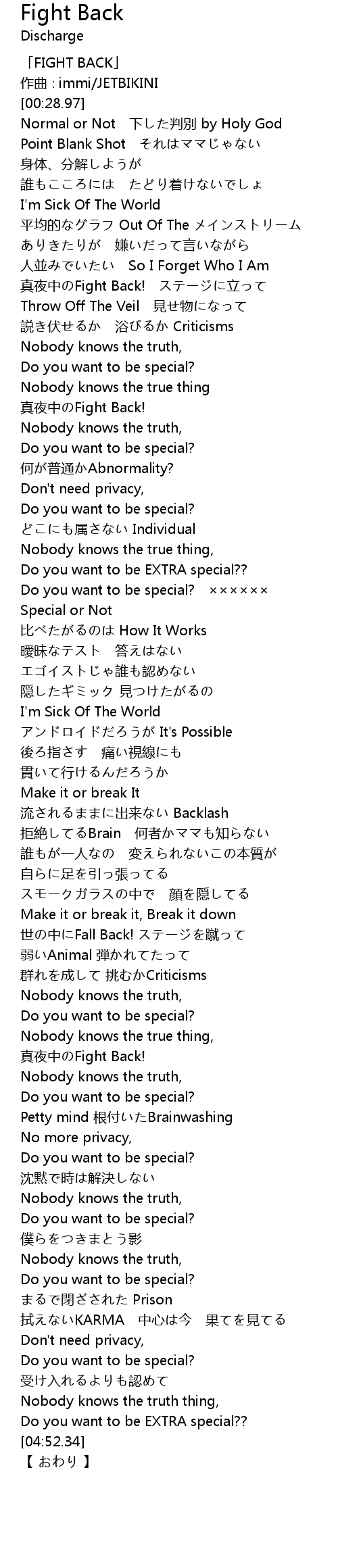 | [01:01.98] | zhēn yè zhōng Fight Back! lì |