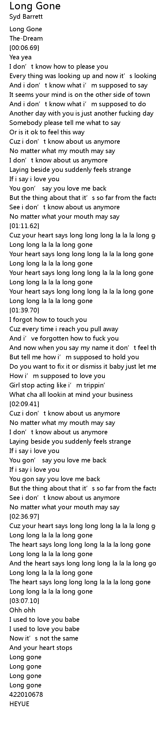 | [02:37.61] | Cuz your heart says long long long la la la long gone |