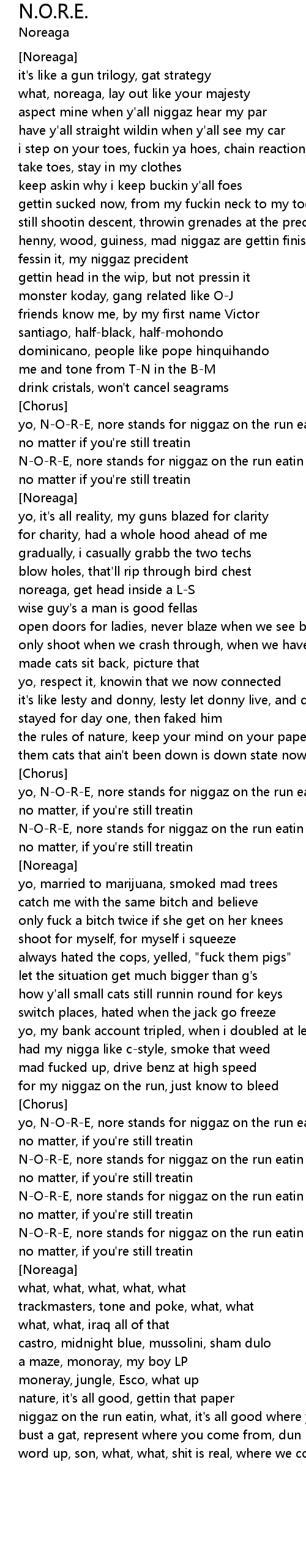 yo, N-O-R-E, nore stands for niggaz on the run eatin