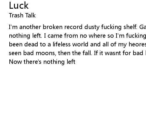 | I'm another broken record dusty fucking shelf. Gave it all I had an now theres nothing left. I came from no where so I'm fucking destined for nothing. I've been dead to a lifeless world and all of my heores are here in the dirt. I've seen bad moons, then the fall. If it wasnt for bad luck i'd have no luck at all. Now there's nothing left |