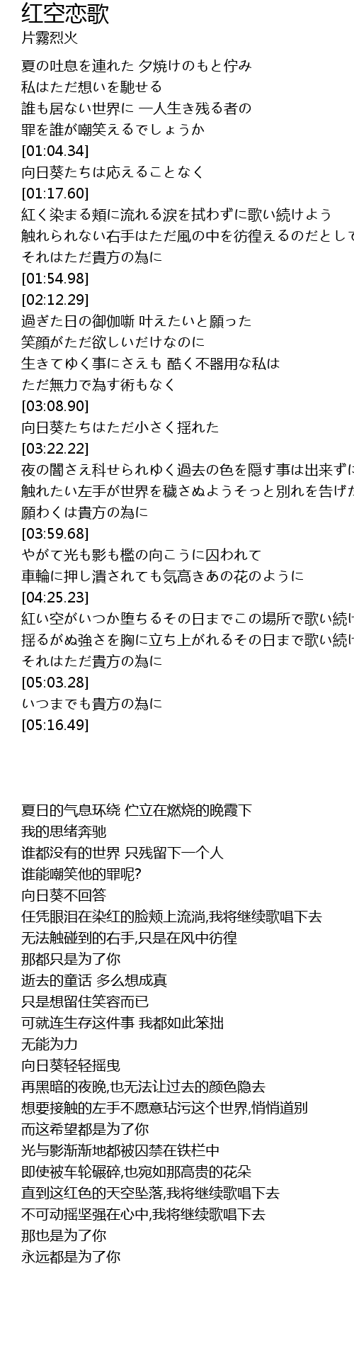 | [04:26.41] | 紅い空がいつか堕ちるその日までこの場所で歌い続けよう |