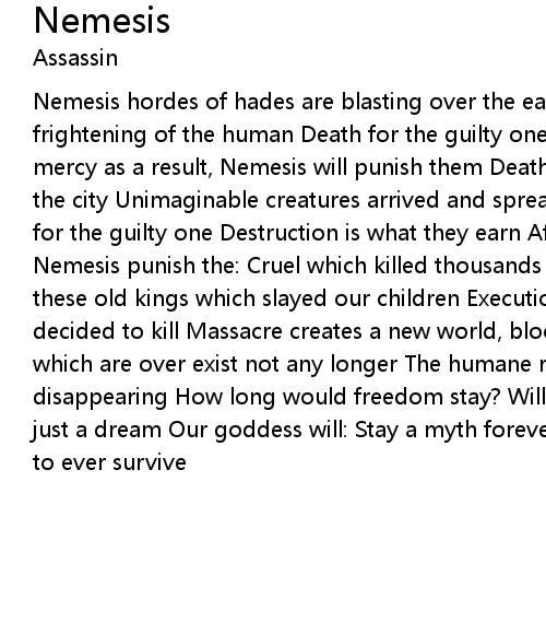 Nemesis hordes of hades are blasting over the earth Saveness diapering frightening of the human Death for the guilty one, no hope is given to them No mercy as a result, Nemesis will punish them Deathly breeze of wind plunging into the city Unimaginable creatures arrived and spread Out into their streets Pain for the guilty one Destruction is what they earn After ruling a period of time, Nemesis punish the: Cruel which killed thousands of innocent lifes Death to these old kings which slayed our children Execution has begun, the goddess decided to kill Massacre creates a new world, blood has to be spoile The horrors which are over exist not any longer The humane race is saved, Nemesis disappearing How long would freedom stay? Will Nemesis save us again or was it just a dream Our goddess will: Stay a myth forever remembered We need her help to ever survive |