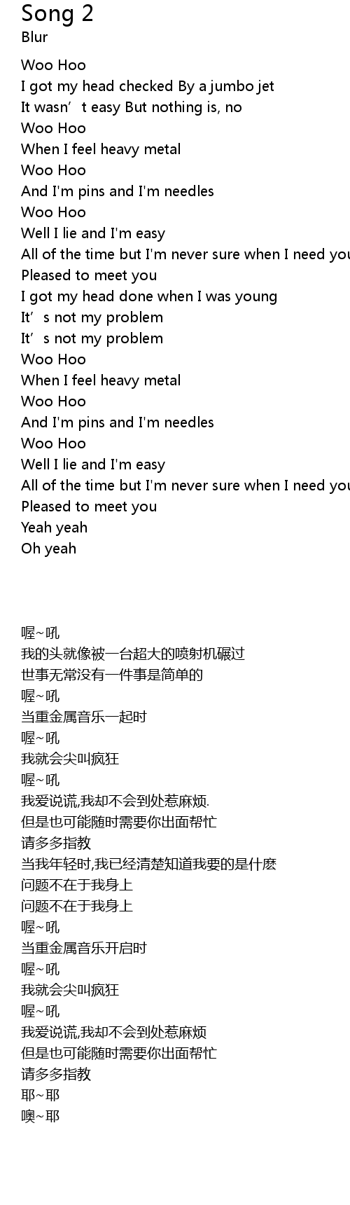 | [00:26.53] | I got my head checked By a jumbo jet |