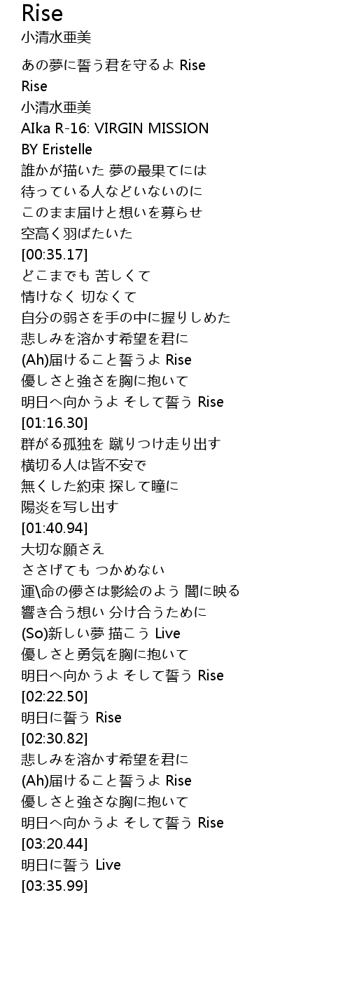 | [03:10.63] | 明日へ向かうよ そして誓う Rise |