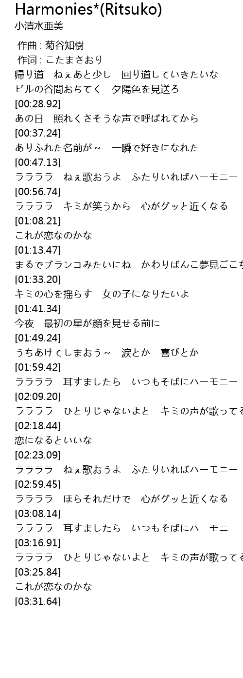 | [02:00.87] | ララララ 耳すましたら いつもそばにハーモニー |