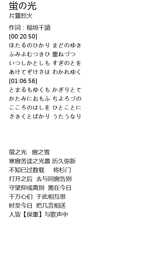 | [00:22.61] | ほたるのひかり まどのゆき |