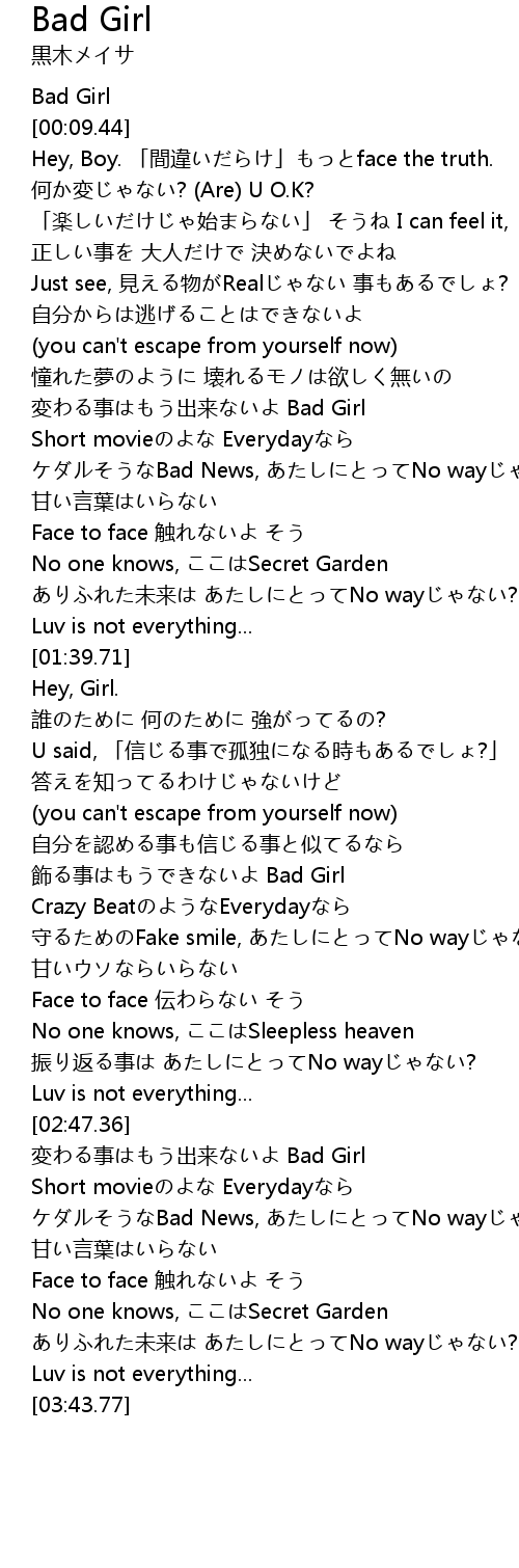 | [01:03.53] | 変わる事はもう出来ないよ Bad Girl |