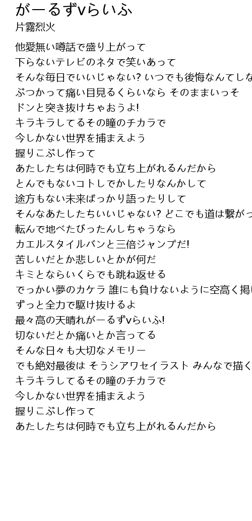 | 苦しいだとか悲しいとかが何だ キミとならいくらでも跳ね返せる | |
