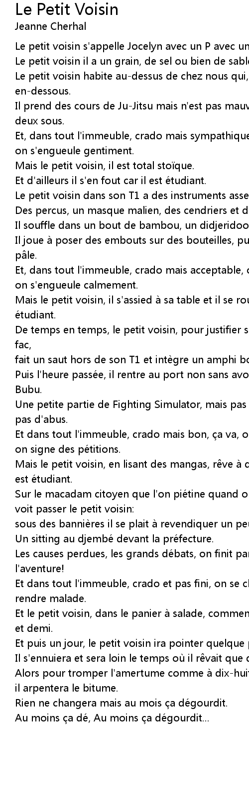 | Le petit voisin s' appelle Jocelyn avec un P avec un F comme dans Martine. | |