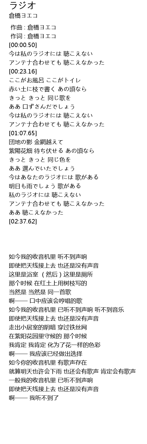 | [00:51.13] | 今は私のラジオには 聴こえない |