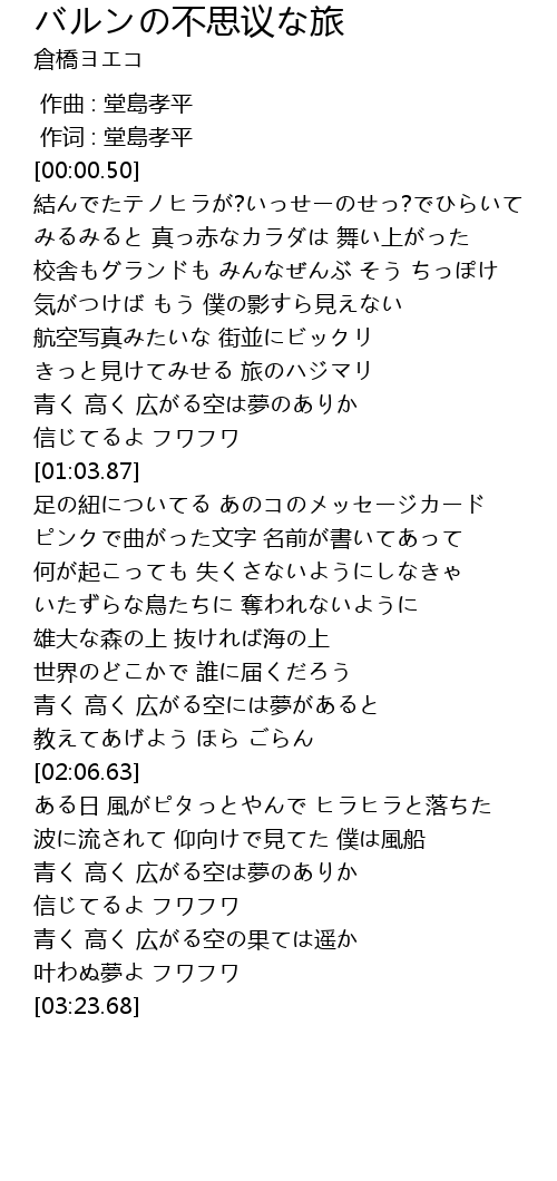 | [03:01.75] | 青く 高く 広がる空の果ては遥か |