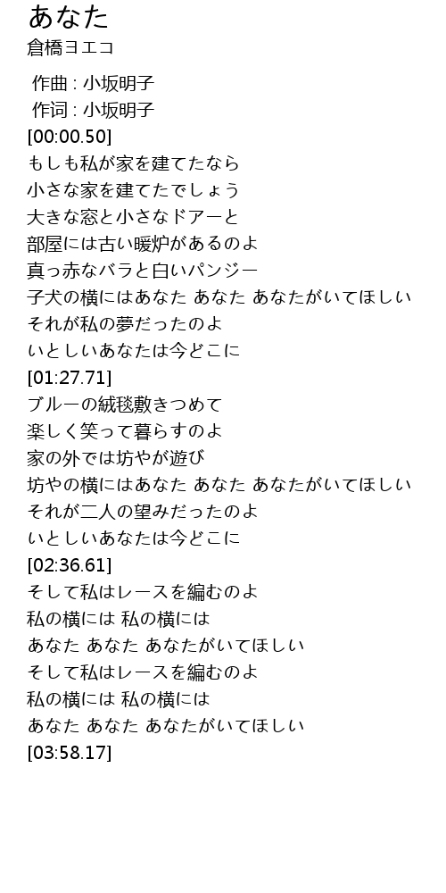 | [03:41.09] | あなた あなた あなたがいてほしい |