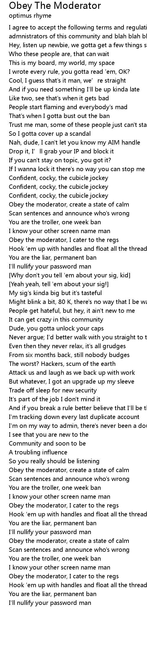 | I agree to accept the following terms and regulations put forth by the admnistrators of this community and blah blah blah. I accept. | |