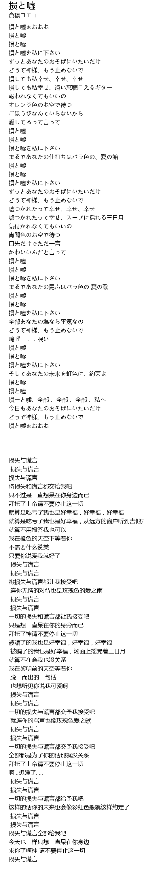 | [03:47.180] | 損ーと嘘、全部 、全部 、全部 、私へ |