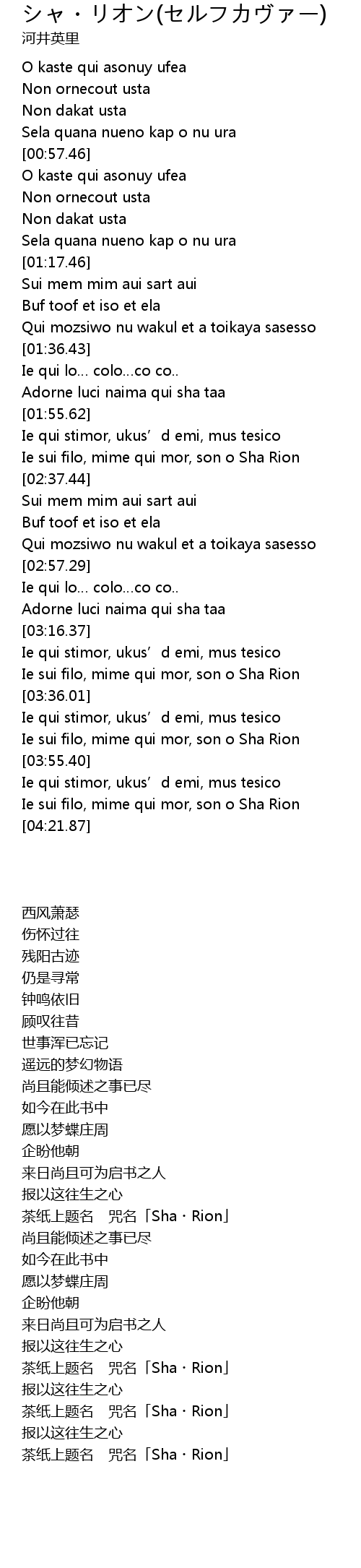 | [02:05.89] | Ie sui filo, mime qui mor, son o Sha Rion |