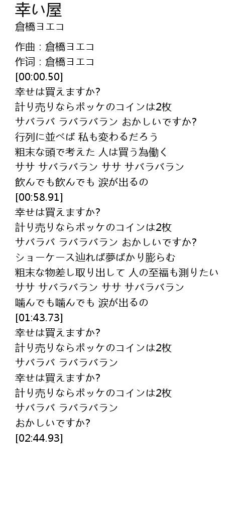 | [00:16.86] | 幸せは買えますか? 計り売りならポッケのコインは2枚 |