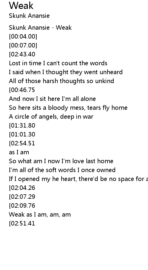 [02:59.18][02:54.51][02:49.78][02:44.33][02:34.28][02:29.16][02:24.49][01:46.77][01:06.31] Weak as I am