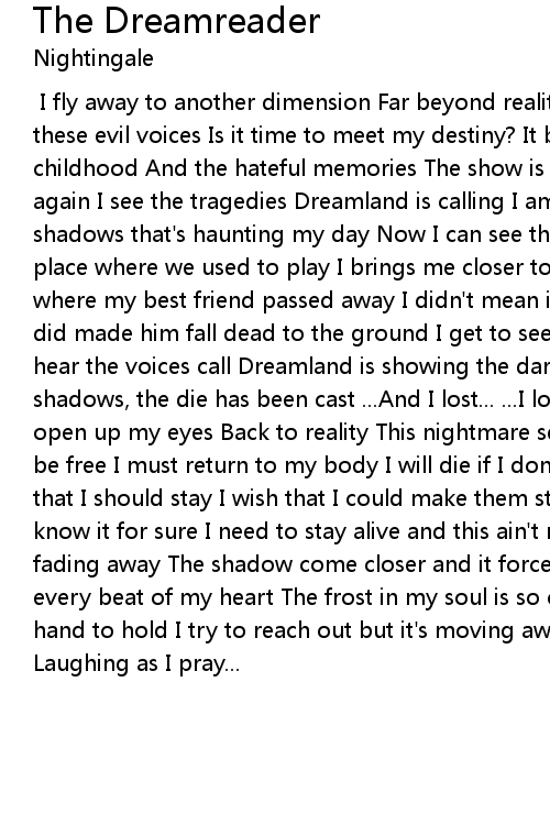 [ Swano ] I fly away to another dimension Far beyond reality I fly away from these evil voices Is it time to meet my destiny? It brings me back to my childhood And the hateful memories The show is rolling before my eyes And once again I see the tragedies Dreamland is calling I am drifting away Far from the shadows that's haunting my day Now I can see the old wood hillside That's the place where we used to play I brings me closer to the place I fear The place where my best friend passed away I didn't mean it, I couldn't know But what I did made him fall dead to the ground I get to see the scene repeated And then I hear the voices call Dreamland is showing the dark of my past One with the shadows, the die has been cast ...And I lost... ...I lost... Let me wake, let me open up my eyes Back to reality This nightmare seems so real There is no way to be free I must return to my body I will die if I don't wake up The voices say that I should stay I wish that I could make them stop Dreamland is hell and I know it for sure I need to stay alive and this ain't no cure I feel that I am fading away The shadow come closer and it forces to stay I'm falling apart with every beat of my heart The frost in my soul is so cold And in the haze I see a hand to hold I try to reach out but it's moving away And the voices are laughing Laughing as I pray... |
