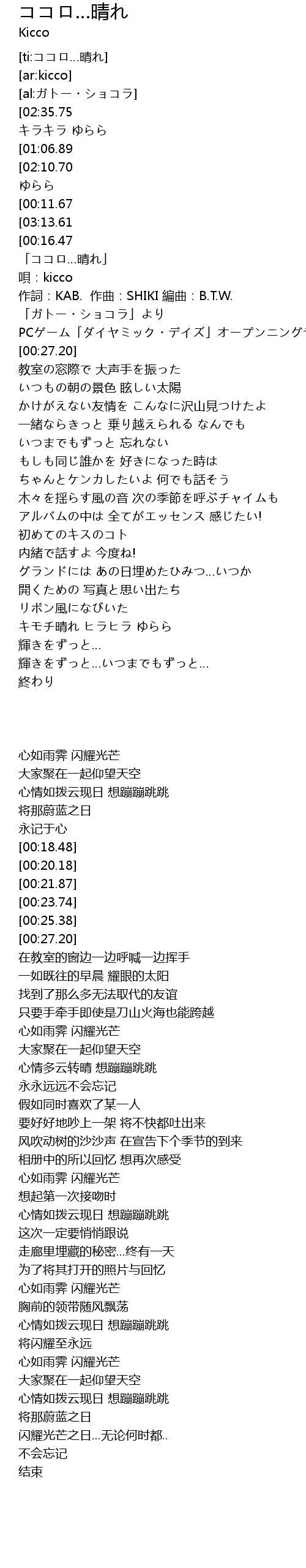 | [02:51.68][02:35.75][02:03.83][01:03.32][00:01.16] | ココロ…晴れ キラキラ ゆらら |