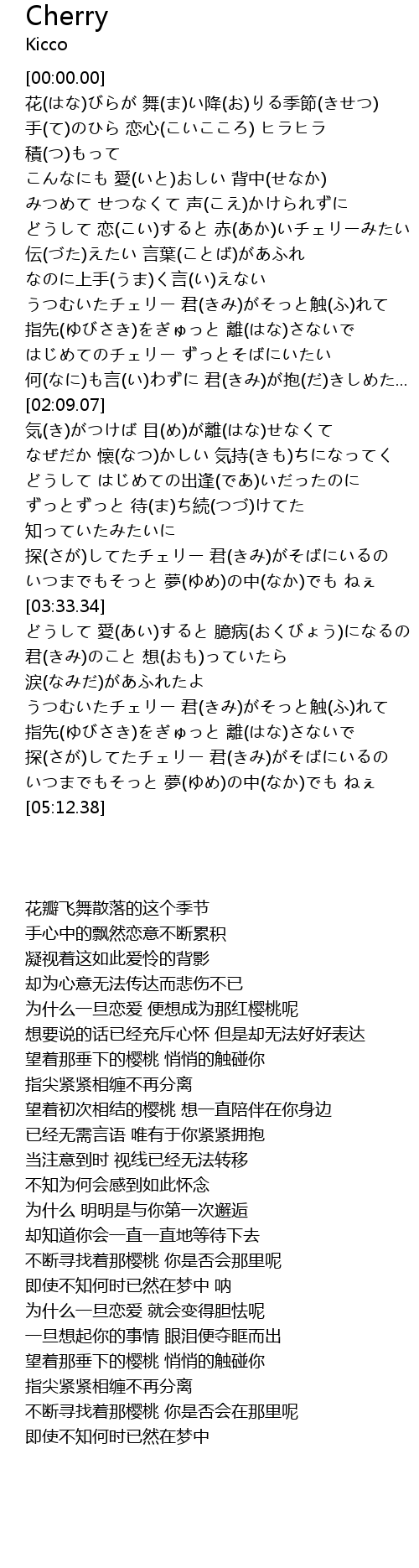 | [03:09.65] | 探(さが)してたチェリー 君(きみ)がそばにいるの |