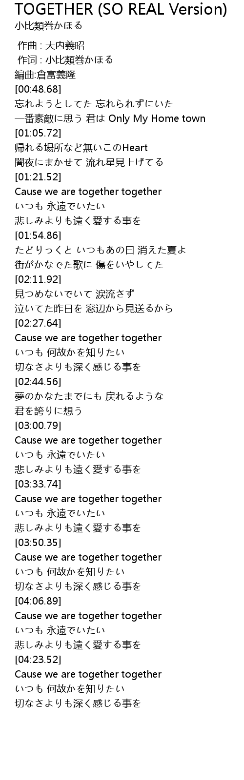 | [04:23.78] | Cause we are together together |