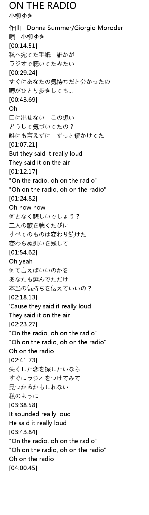 | [02:28.76] | "Oh on the radio, oh on the radio" |